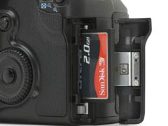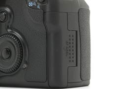 存储卡仓的设计没有改变,20D支持CFI/CFII和Microdrive,也支持容量大于2GB的存储卡。存储卡读写灯位置由原来的仓门搬到了拨盘旁边。