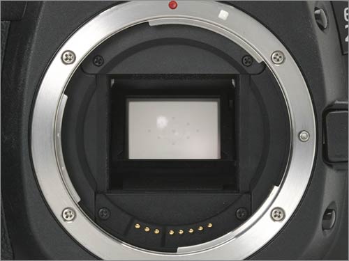 卡口方面,20D支持EF和EF-S卡口,镜头焦距转换系数依然是1.6。因为要支持EF-S卡口镜头,20D的反光镜盒和反光镜要做得比10D小一点,虽然反光镜缩小,但并不影响取景的像场和亮度。