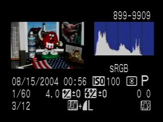 最简单的显示,全屏显示时按下INFO键可以看到所有拍摄参数,包括色彩空间、测光模式、直方图等,不过直方图只显示混合通道,稍嫌不够专业。