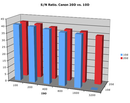 从上面可以看到,20D在ISO100时的信噪比反而上升了,其它的ISO值下的下降也不是太严重,可见佳能在CMOS做工上的进步,800万像素在APS-C尺寸CCD上似乎还不算太密集。不过随着像素的上升,这种高信噪比是否能持续下去,我们拭目以待。