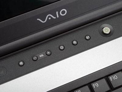 打开上盖首先看到的是在与外部同样的磨沙银包围下的黑色键盘。显示屏的四周是一圈黑色的外边,下面的边上的正中间有一个小的银色VAIO的LOGO。在屏幕的下面你可以找到一对音质非常不错的立体声喇叭。在两个喇叭之间是一个银色的电源按钮、一个静音按钮、音量按钮和屏幕背光调节按钮。