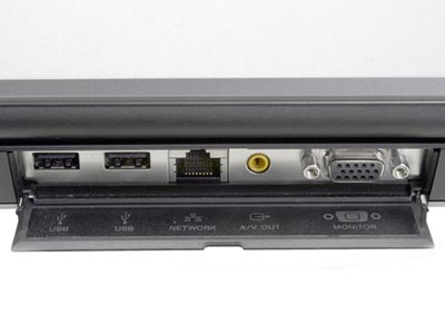 除此之外还有几个指示灯,分别用来指示电源、电池、硬盘和光驱的情况。在机身的左侧有一个Type II PC卡插槽、一个USB 2.0端口、一个四针的FireWire端口、一个耳机插孔和一个麦克风插孔。在机身的后面(如图9)你可以找到一个电源插口、两个USB 2.0端口、一个以太网接口、一个A/V输出接口和一个D-SUB接口。总而言之Sony提供了几乎所有你可以想得到的连接端口。
