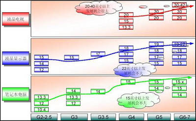 不赚钱的产品是不需要扩张生产线的,而且现在面板厂基本以比较成熟的5代线为主流。5代线和4代线的区别就是更适合切割17寸液晶。从利用率上来说,一块相同大小的面板,切割17寸面板的基板利用率为87%,而切割15寸面板的基板利用率不到80%……没有理由在没有利润的产品上下大力气。同时,5代线还提高了厂商的生产效率,以三星已经量产的第五代线为例,满载产能时,若全数用以生产17寸面板,单月的面板产出大约相当于一座3.5代生产线的六倍左右,但是其投资金额也不过只是二倍多一点而已,因此17寸面板倍受欢迎(如图7),而15寸面板则可能会在LCD显示器应用领域中慢慢被厂商遗忘……