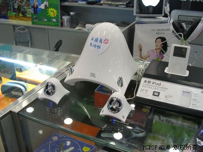 这就是名为JBL creature 太空战士的一款多媒体2.1音箱。提起它的出处Harman Multimedia公司,相信懂行的发烧友们应该都不陌生吧!它可是世界知名的音响设备制造商,其生产的产品大多以高品质为世人所著称。今天,小编看到的这款是以白色为主的一套音箱组合。低音炮和卫星音箱的大小虽有所差别,但形状统一。外观可以说既像UFO,也像水母,您自己去想象吧。但不管怎么说,它的出现都会令人眼前一亮。