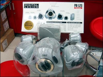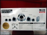 这套名为DigitalLEGION PM-520的音箱,造型十分独特,突破了传统音箱的造型,摆放在家中视觉效果也不错。这是低音炮和两个稍大的卫星音箱。三个小卫星音箱,其中一个当中置。PM-520带有一个调节控制器,摆放在桌面上方便操控整套音箱。这套音箱商家报价为200元,对于一款造型另类的5.1音箱来说,还是个不错的价格。