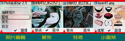 在 SL65 的应用程序中,附有照片编辑软件,里头多了扭曲、变形、负片、怀旧 … 等特效,可以在拍摄完成后替照片加上不同的效果,保证增添许多乐趣。此外,还内建相框以及小可爱的图案,可以加到到相片上。