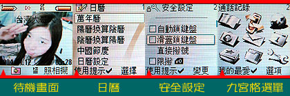 SL65 所拍摄好的照片能够作为待机画面,那么就设定最得意的作品陪伴你吧!内建的日历功能能够转换阴阳历,还将中国节庆的国历日期都记录好了,看样子,设计者非常细心。SL65 还有安全设定功能,除了 PIN 码的锁定之外,还有键盘锁,可选择自动锁上或是随滑盖锁上。SL65 采用常用的九宫格选单,对于已经习惯这个接口的国人而言,初次操作时,一定可以立即上手。