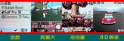 拥有加强版 3D 引擎加速的 SL65,内建的游戏当然也少不了「3D」这个好东西。SL65 内建的 3 款游戏中,就有两款具有 3D 立体画面,分别是刺激的 3D 立体赛车和需要技巧的高尔夫游戏。在小编亲身体验之后,发现 SL65 的 3D 游戏画面跑起来真是顺畅,算是大大改善了以往 3D 游戏总是慢半拍的缺点。若是玩这些游戏玩腻了,觉得达不到更高境界,SL65 还支持 JAVA 应用程序,你可以上网下载更多、更高技巧的游戏,让多样的游戏陪伴你度过无聊的时光。