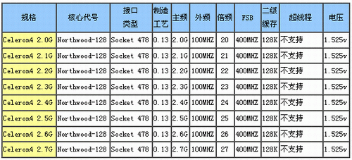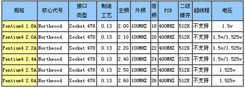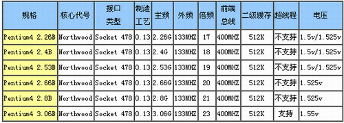 [低端市场之二:P4A、P4B,Northwood核心处理器全上场] 基于Northwood核心处理器采用了更先进的0.13微米制造工艺,工作电压降低到1.5V左右,相比Willamette核心的处理器,其主频有了很大改善,二级缓存也从256K提升到了512KB,早期Northwood核心的P4、C4处理器外频依然只有100MHz,前端总线最大支持到400MHz,为了与主频相同但只拥有256KB二级缓存的Willamette核心P4处理器区别开,Intel在其处理器编号后面加了一个大写字母“A”,主要型号有: P4 Northwood核心 A 系列处理器 由于核心工艺的提升,基于Northwood核心的P4A和C4系列CPU外频一般都可以工作在133MHz即533MHz的前端总线上,尤其低频版的C4,例如C42.0,由于主频较低、二级缓存小、工艺先进、核心电压低等因素,拥有很高的超频潜力,配合超频功能丰富的主板可以轻松超取到3G以上的水平,具有很高的性价比。 Northwood核心的C4由于外频和二级缓存与Willamette核心Socket 478接口的C4一模一样,因此从外观上很难区分。不过采用Northwood核心的C4主频是从2.0G起跳,而且核心电压仅有1.525V,只要具备这两个条件就可以断定是Northwood核心的C4,其主要型号有: Northwood核心的赛扬4得益于工艺的提升,后期推出的P4和C4处理器都正式提供了对133MHz外频的支持,前端总线最高支持533MHz,为了与早期FSB仅为400MHz的处理器区别开来,Intel在其编号后加了一个大写字母B来进行区分,其主要型号有:P4 Northwood核心B系列处理器推荐最佳主板配置:首选Intel的I845PE、SIS的SIS655,备选:Intel的Intel E7205 、I845GE、I845E、I845G、I845GV、SIS的SIS648、SIS645DX、SIS651、SIS650GX、VIA的P4X400A、P4X400、P4X333、P4X266A、P4M266A、P4M333、P4M400A、AIT的RADEON 9100 IGP等。推荐理由:由于Northwood核心P4A、P4B 和C4都提供对533MHz的前端总线的支持,因此与其配套的主板要求至少提供533MHz的FSB,DDR333甚至更高的内存标准。作为首选的Intel845PE,标准情况下支持533MHz FSB和DDR333内存标准,但由于推出时间较晚,加上厂商的后期开发,基于I845PE芯片组的大部分主板除了提供800MHz的FSB外,还可以支持单条DDR400内存,在一定程序上缓解了Intel I865以下芯片组不支持双通道而引发的带宽危机,此外6*USB2.0标准也使这款主板拥有极好的性价比。Intel I845PE主板I845PE因为出身“名门望族”所以我们将其作为首选推荐配置,实际上SIS的SIS655则是一款性能更为强劲的芯片组,只是因为SIS向来偏安一隅而不能广为人知, SIS655芯片组是SIS首款支持双通道技术的主板芯片组,默认情况下SiS655支持双DDR333内存通道,533MHz的前端总线,而实际上对双DDR400内存通道也提供了完美的支持,这样其内存带宽就高达2*400*64/8=6.4GB/s,应付800MHz的前端总线也绰绰有余,此外,SiS655同样支持Intel引以为荣的Hyper-Threading“超线程”技术,Intel同档次芯片组所不支持的AGP 8X和IEEE1394技术,众多超前的技术都使SIS655在配合P4A、P4B、C4甚至是P4C系列处理器都能发挥出强大的性能,对于那些“不计门第”的用户来说,SIS655实在是一个非常不错的选择。SIS655芯片组做为备选芯片组,Intel的E7205也是一款不错的芯片组,支持533MHz FSB,双DDR266内存通道,在性能上强于I845PE而稍逊于SIS655,由于定位于入门级工作站,在DIY市场并不多见,因此做为备选项推荐。I845E、I845G、I845GV则属于同一档次的芯片组,都支持533MHz FSB,单通道DDR266,6*USB2.0,也有部分主板甚至支持800MHz FSB,但仅支持 单通道DDR266使这一特性并没有多大的实际意义。I845GE和I845PE属于同一个档次,支持533MHz FSB和单通道DDR333,这几款芯片组由于系出名门加上兼容性稳定性较好,市场上型号和数量较多而且价格也较便宜,对于价格较为敏感的用户可以优先考虑。此外ATI的RADEON 9100 IGP性价比更为出众,它除了支持800MHz FSB和超线程技术外,支持DDR333双通道内存技术和AGP8X技术,而且集成一块性能相当于Radeon9200的显卡。关于它的详细情况大家可参考我站《整合,不是无用的别名!》一文。ATi 9100IGP芯片组