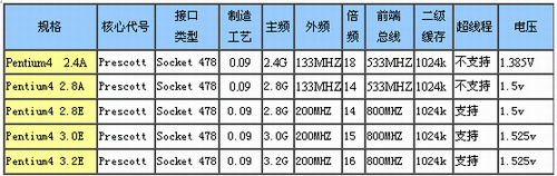 注意:2.4A和2.8A同样基于Prescott核心,不过外频只有133MHz,且不支持超线程技术。与Northwood核心A系列P4有着本质的不同,不过依然可以从二级缓存或前端总线上来判断。