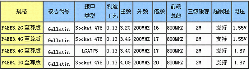 Pentium4 Extreme Edition处理器即P4EE至尊版是Intel在Prescott核心P4推出之前最强的桌面处理器了,它是Intel为了应对AMD64位处理器的发布而推出的一系列超级处理器,P4 EE采用0.13微米制造工艺,一级缓存和二级缓存容量与Northwood核心的P4一样,不同的是增加了高达2M的三级缓存,支持最高800MHz的前端总线,有Socket478和LGA775两种接口,前者可兼容于所有支持800MHz FSB的Socket 478主板,而后者则需要I915/925芯片组的支持,性能傲视高端市场,缺点是售价奇高,功耗较大,对于一般用户而言,没有什么实际的使用意义。目前其已有型号主要有四款:
