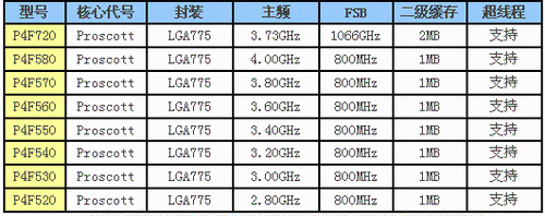 LGA 775 封装的处理器首次改用型号来命名,将采用该封装的处理器分为3/5/7三个类别,低端的赛扬D即属于3系列,定位于低端市场,采用256K二级缓存,533MHzFSB,且不支持超线程技术;5系列定位中端主流市场,主频从2.8G直至4G,800MHzFSB,1M二级缓存,提供对超线程技术的支持,而7系列则定位于高端处理器市场,起始主频为3.73G,1066GHz FSB,2M的二级缓存,支持超线程.P4系列主要型号如下: