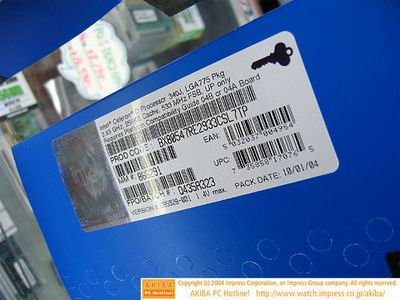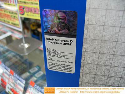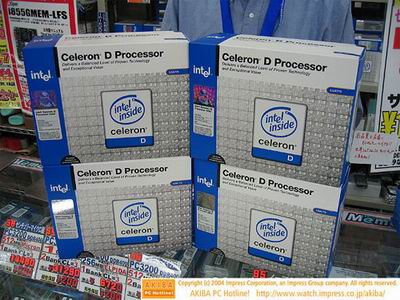 LGA775版的Celeron D处理器,日前在日本秋叶原电脑市场上市。预定价340J(2.93GHz)14,458日圆~14,994日圆、335J(2.80GHz)12,568日圆~12,894日圆、330J(2.66GHz)10,258日圆~10,300日圆、325J(2.53GHz)9,744日圆~9,810日圆。这几款LGA775赛扬处理器结尾都以J注明支持No eXecute bit(NX bit)反病毒功能。