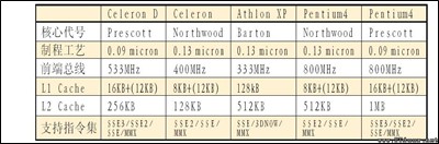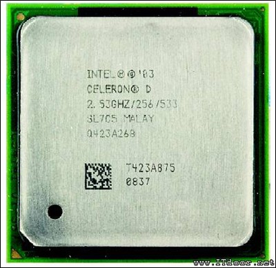 赛扬D 是Northwood 核心赛扬处理器的替代产品,它采用了90 纳米的Prescott核心,L1 Data Cache 由8KB 增至16KB,L2 Cache 同样增大了一倍,达到了256KB。其次,赛扬D 的前端总线也由Northwood 赛扬时的400MHz 提升至533MHz,并且在多媒体指令集方面增加了13 条SEE3 指令。