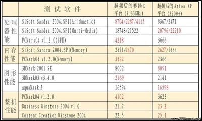 测试结果有点不可思议:PCMark04 v1.2.0 的测试结果显示所有的项目都是赛扬D 平台胜出,而从SiSoftSandra 2004.SP1、3DMark 2001 SE、AquaMark 3、Business Winstone 2004 v1.0、Content Creation Winstone 2004 等软件的成绩来看,超频后的Athlon XP应该稍有优势,特别是在商业办公、多媒体内容创建方面优势明显。