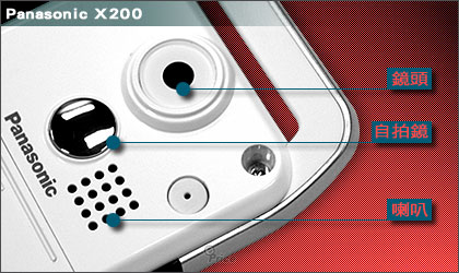 X200 将 30 万画素相机镜头设计在机身背面上方处,镜头微微凸起,所在位置明确。下方为自拍小镜,使用相机自拍时,相当地方便。在自拍镜旁的喇叭,以 16 个小孔排列成正方形,让铃声更为响亮。