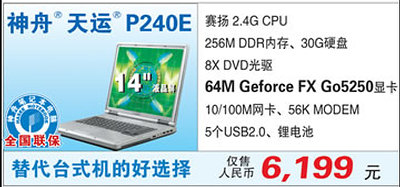 神舟天运P240E 这款带有GeForce FX5250 64M独立显卡的笔记本市场仅售6199元,高性价比优势令这款笔记本一面世就具有极高的竞争力。P240E采用了赛扬2.4G处理器,256M DDR内存,30G硬盘,8X DVD光驱和14寸液晶显示屏,并配有网卡和MODEM,由于配置了64M显存的GeForce FX Go5250 64M独立显卡,全面支持DirextX9,其3D性能比集成显卡有大幅度提升,是游戏爱好者的好选择。