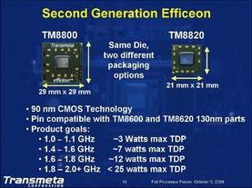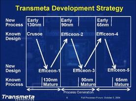 Efficeon是Transmeta的第二代CPU架构。继0.13μm版的Efficeon-1推出之后,90nm制程的Efficeon-2也开始投入市场同时,夏普更是抢先一步推出搭载该处理器的笔记本电脑。Transmeta的创业者兼副会长兼CTO David R.Ditzel代表全美达进行了演说,明确表示Efficeon-3的开发工作正在紧张筹备当中。Transmeta的开发循环模式是每一代的处理器都会引入新的CPU架构,而每个架构都会横跨两代的CPU。Transmeta每两年进行一次推移更新,每两年导入新的CPU架构,而在这两年的时间内还会研发相应处理器的简化版。例如0.13μm制程的Efficeon-1在2003年推出,今年2004年则推出同是Efficeon-1架构但转到90nm制程的Efficeon-2。然后估计到2005年推出同时90nm制程但采用新架构的Efficeon-3,到2006年如果切实可行的话将会推出65nm制程的Efficeon-3,即Efficeon-4。