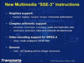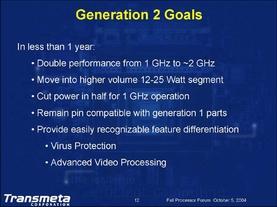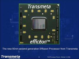 10月4日在美国圣何塞市举行的微处理器论坛大会中,Transmeta(全美达)明确表示今后将进一步扩大Efficeon家族处理器的发展。同时还得知,在刚推出不久的90nm制程的Efficeon-2之后,将会有新改良架构的90nm制程Efficeon-3推出。而且对64Bit扩展指令、VirtualMachine(软件虚拟硬件)功能的支持等核心技术的将来发展动向进行了说明。此外,会场中还播放了以Efficeon-2 2GHz的DEMO演示。