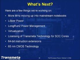 Transmeta以往的0.18μm处理器由IBM负责,0.13μm由TSMC,到90nm处理器则由富士通承担,几乎每代的处理器都由不同的厂家负责生产,之后的65nm制程处理器将会由何家负责呢,我们拭目以待。