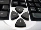 在键盘的正上方,那一排功能键也是作用颇大的。从左到右依次可分为Office快捷键区、应用程序快捷键区、多媒体快捷键区和Internet快捷键区。由于按键上都有比较明确的图示说明,所以在这里小编就不再介绍了。而在键盘上,还有一处地方可以看出它和“X”系列的V2000机箱有联系,就是那四个相对独立的方向键位。从上往下正看的时候,你就会觉得这四个键是被“X”给分割开的。这也不失为是个较有个性的设计。