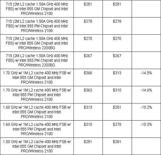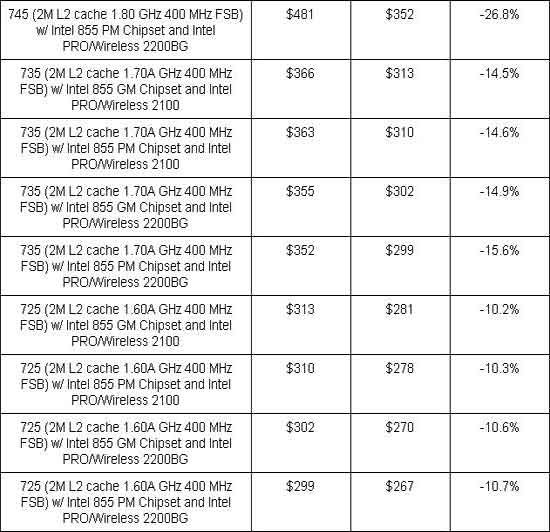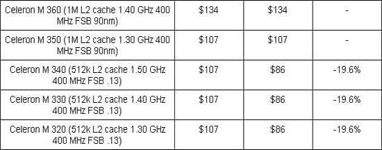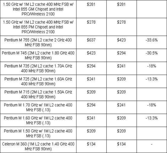 在实施降价计划后,高端的奔腾M755处理器价格将由637美元下降至423美元,降幅达34%,奔腾M745处理器价格将由423美元下降至294美元,低端的1.6GHz奔腾M处理器售价由241美元下降至209美元。基于755芯片的迅驰处理器最高售价由706美元下降至695美元,最低售价由495美元下降至481美元。