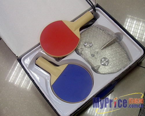 该产品主要由三大件组成,一个主控台(同时也是无线信号接收器),两个电子乒乓球拍。将主控台用视频和音频线与电视相连,每个乒乓球拍都装好两节AAA电池,然后开机,就可以直接和电视上的小健将进行“单挑”了。