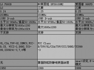 闲话少说,笔者根据这个价格区间到市场上和往上搜罗了一回,归纳有以下12款处于2000±200元价位的19寸CRT显示器。这些显示器当中有我们熟悉的国际品牌,也有一些我们接触得比较少的显示器品牌。在挑选一款显示器之前,相信各位必定会先对备选的显示器进行一些参数上的了解吧?放心,笔者已经帮你完成了这一步,请看下表:
