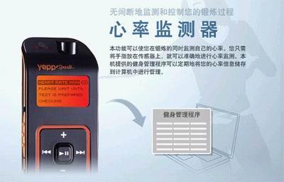 它可播放MP3/WMA格式,支持高音质的SRS WOW音效,会给你带来丰富的低音和真实3D立体音响效果,还能自由设定8种EQ模式,令你的MP3歌曲更加精彩。附加功能为录音和直录,其中直录还支持变频自编码录音,可将外部音源转换为MP3格式以后,储存在yepp里面,并可设定音质。它在功能上与运动有着“不解之缘”??棉板上设计有一个微型的探测器,只要将手指放在上面,就可以进行热量消耗(卡路里)的计算,运动时的心率也可通过曲线和数字显示在LCD上。热量消耗和心率监测功能很实用,前者可以测出你运动的过程中总共消耗的热量,从而让你知道是否达到了预先的锻炼目标,后者则可随时功能手你的心跳,时间越长,就越可以让你对自己的健康“心中有数”。除此之外,YP-66内置的多人跑表功能也首次出现在MP3随身听这类产品之中。