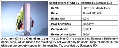 三星SDI日前开发出了一种最新32英寸CRT,厚度只有35cm!基于该CRT的电视产品厚度可以做到仅仅38cm,真是超薄啊!