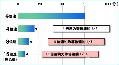 所以为什么1X的DVD写入4.7GB需60分钟(DVD的一倍速是1350KB/s),2X是30分钟,4X约15分钟,而8倍以上无法缩短成7.5分钟就是因为内圈的数据写入是用低倍速,到外圈才用高倍速来写入,所以16X的写入时间也不会是1X的1/16,而是6分钟左右。