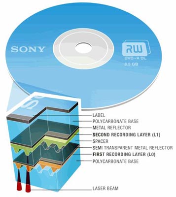 单层的DVD盘片由五层组成,由上而下分别是标签层、保护层、金属全反射层、金属半反射层和资料层,而双层的DVD则有八层,由上到下是标签层、保护层(聚碳酸酯,防止染料层与反射层被氧化)、金属反射层、染料层L1、间隔层、半透光性金属反射层、染料层L0、保护层。看起有点像是两片单层的DVD黏在一起,只是中间的黏胶为半透光性,第一层的染料层(L0)为半透明,然后用不同波长的激光分别写入数据在上下两层中。