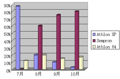 上图为AMD主流处理器产品在本地市场的占有比例变化情况 从该图表中不同处理器在不同阶段的市场占有率变化来看,随着AMD市场策略的改变,Athlon XP,Sempron,Athlon 64之间的占有比例已经发生了相当明显的改变。