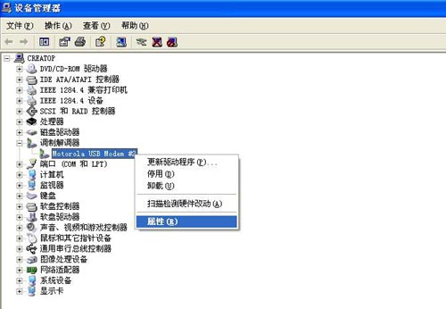 2、接着右键点击“Motorola USB Modem”,在弹出的菜单中选择“属性”,如下图: