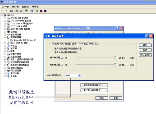 4、在新弹出的窗口中,“COM端口号”所显示的端口号就是MIDway2.8中设置的端口号,本人的是COM4,如下图: