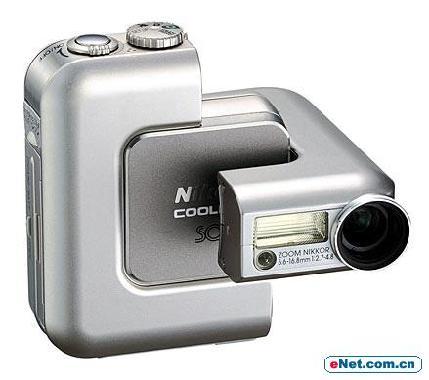 只要看到Coolpix SQ的外观,所有人都会觉得这款数码相机最大的特色就是富有天才般想象力的外观设计,全金属的外壳设计以简洁的线条给人方方正正的感觉,中间很明显有这款数码相机的标记,我们注意到机身中有明显可以转动的痕迹。 没错,这就是尼康独特的旋转式镜头,应该说是SQ的主要卖点了,我们进行了细心的观察,当你没有打开数码相机的时候,镜头和闪光灯的位置会位于相机顶部,也就是和电源开关、快门键和模式转盘处于同一平面,而当你需要进行摄影的时候,你就需要对镜头进行转动,具体的方法是用你的左手把相机的镜头部件往外翻转90度,这时候你会发现镜头和闪光灯已经位于相机的正面了,就像其他数码相机一样。