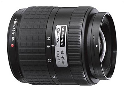 奥林巴斯ZUIKO DIGITAL 14-45mm为随机标配镜头,其结构为12片10组,具有2片非球面镜片,其最近对焦距离为38厘米,最大光圈为F3.5,长焦端为F5.6,最小光圈为F22,其变焦范围相当于35mm相机的28-90mm,属于常用镜头。其重量为285克。