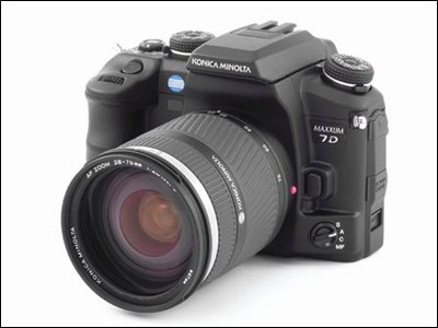柯尼卡美能达α7D采用了金属机身,采用23.5×15.7 mm尺寸的CCD作为感光元件,有效像素为600万,最大可以拍摄3008×2000像素照片,柯美在这款数码单反上整合了AS也就是CCD防抖技术,兼容美能达的AF卡口镜头,倍率为1.5。这款数码单反支持9点自动对焦,7种白平衡模式,ISO感光度最高可以达到ISO1600,快门速度最快可以达到1/4000秒,支持最慢30秒B门,连拍速度为每秒3张,最高可以连拍12张照片,其LCD为2.5英寸,20.7万像素,存储介质为CF、CFⅡ卡,采用锂电池供电。