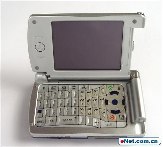 摩托罗拉MPx最让人惊奇的就是它的键盘区了。这个键盘区感觉有点像鱼鳞,因为有那种反射的光泽,并且这个键盘具有26个按键,横向使用时正好可以做文字输入键盘使用,而竖向使用时,则是手机按键的设计。打开翻盖一个完美融合了QWERT键盘,数字键,导航键和功能键的键盘映入眼帘,在这么小的键盘上可以科学的排列这么多按键可见摩托罗拉设计师们的功力,但是这么小的按键按起来颇费劲。幸好MPx同时支持手写输入。