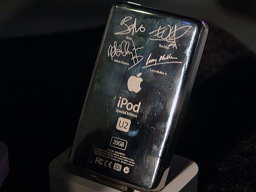 U2 iPod是苹果公司与U2乐队及环球唱片(UMG)为数码音乐新时代携手共创革新产品的一部分,它能够容纳5000首歌曲,拥有华丽的黑色外壳及红色的点击式转盘,背面还刻有U2乐队全体成员签名。