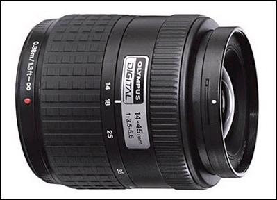 奥林巴斯ZUIKO DIGITAL 14-45mm为随机标配镜头,其结构为12片10组,具有2片非球面镜片,其最近对焦距离为38厘米,最大光圈为F3.5,长焦端为F5.6,最小光圈为F22,其变焦范围相当于35mm相机的28-90mm,其重量为285克。