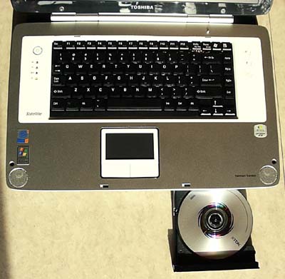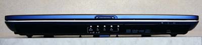 光驱位于机身前方而不是目前大多数笔记本所用的右侧。起初我以为是一个失败的设计,但当我在躺椅上使用它时,才发现由于17吋宽屏笔记本本身就比较宽,当将它放在腿上使用时,要打开侧面的光驱就不得不将身体前倾,而位于笔记本正面的光驱就没有这个问题,这是我中意它的原因之一。其实即使是放在桌子上使用,位于下面也比侧面要方便许多。而且,光驱打开时也不会发生空间拥挤的问题,总而言之,我对它的这个设计非常满意。