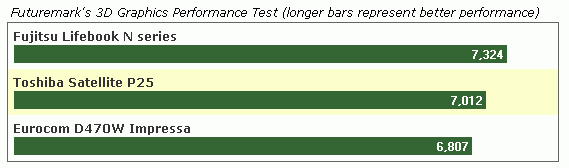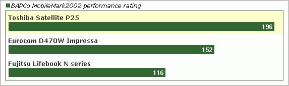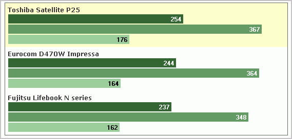 在与同等级的富士通N5000系列以及Eurocom D4702 Impressa进行对比测试时,Satellite P25的移动性能远远胜过其他二者。这其中很大一部分原因是P25采用了高达3.2GHz的台式机CPU,这一点从下面的图中就可以看出来:
