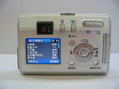 宾得S40采用400万像素1/2.5英寸CCD。3倍光学变焦镜头,相当于35mm相机35-105mm,镜头采用5组6片镜片设计。并且还4倍数码变焦。最近微距拍摄为6cm。背部配备了1.6寸LCD显示屏,约8.5万像素。具备2种测光方式,4种用户自定义模式,以及多种场景模式。