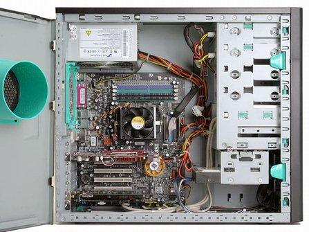 Axis Xcelsior系统的每个部件都采用了免工具安装设计,为了加强散热效果,Evesham公司的设计人员在主机侧面板正对CPU风扇的地方挖了一个孔,并安放了一个用来能直接从外界抽入冷风的风道。机箱里的每根线缆都经过仔细捆扎,这样主机内部不仅显得井井有条,腾出的空间也更有利于散热。