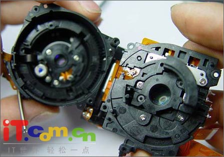 数码相机的快门历来都是故障的高发地带,当一款数码相机还在制造工厂里的时候,快门不开放就是工厂模式下比较棘手的故障项目。在各大数码影像论坛都有关于某个型号的数码相机的快门寿命只有5万次或几万次的讨论,这种说法虽然没有厂商的官方数据作证,但从某种角度来说是有一定道理的。首先不要混淆快门叶片与光圈叶片的外形,我们经常在网上看到的相机内部结构透视图中出现的大多为光圈的外形。通常快门的叶片只有1到2片,而光圈多半为6片或者8片结构。工作正常的数码相机快门叶片异常灵敏,它就像一道闸门控制光线的进入,开放与关闭的驱动方式虽然是接收了微处理器的指令,但是都完全依靠自身的机械转动完成,因此机械磨损在所难免。