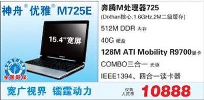 过去人们提及神舟笔记本电脑,往往与中、低档产品联系在一起。其实事情并非如此,譬如喧款本本,拥有9700显卡的15寸宽屏本,眼下为1万元左右,在家电功能方面,却有着无可挑剔的个性特征,它,就是优雅M725E。