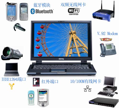 JB6000N将无线网卡由JB6000的IEEE802.11b单频升级至IEEE802.11b/g双频,最高能提供54Mbps的带宽,是以往JB600011Mbps的5倍左右,而且同样兼容以往11Mbps的IEEE802.11b规范,这点算是顺应宽带无线网络大潮的举动。不过更为我们所关注的是JB6000N标配了蓝牙模块,而不再像以往那样作为选件提供,蓝牙模块能提供最大1Mbps的带宽,虽然蓝牙达不到IEEE802.11系列无线网卡的速度,但它要比无线网卡省电得多,模块的体积也小得多,所以在手机,PDA等便携数码产品中得以广泛使用,标配蓝牙模块的JB6000N将可以方便地和这些便携数码设备沟通互动。