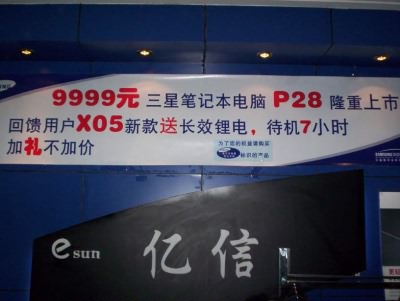 价格从原来就比较优惠的9999元下降到9688元,给消费者更多实惠。 这款机子的配置大体如下: P-M1.5GHz ,256M内存,40G内存,COMBO光驱,14.1 TFT真彩显示器,这些都是目前比较主流的中等配置,既算不上高端,但绝对可以满足一般需求。配合华硕独有的“Power4 Gear”节电技术后,待机时间最长可达 7.4小时,十分惊人。这样的机子笔者认为十分适合那些注重性价比的朋友选购。 市场报价:9688元 惊喜指数:★★★☆ 惊喜理由:华硕经典机型价格一降再降,对这款机子早有兴趣的朋友可以考虑出手了。惊喜不断之三星篇 在黄金周期间表现平平的三星近一段时间似乎突然充满活力,大型广告宣传横幅卖场随处可见,这似乎标志着三星不再满足于作高端摆设,开始大张旗鼓进军销售量最大的中端市场。从前一阵的免费升级内存到最近的万元以下机器的首次亮相,三星那高端的品质似乎离我们越来越近了,真是“旧时高价三星机,飞入寻常百姓家”