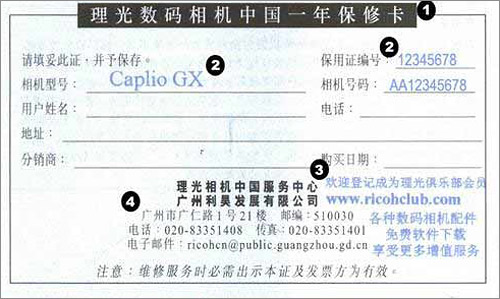 一.理光数码相机中国市场行货保修卡之特征: